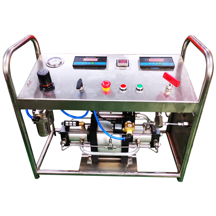 輸出壓力和流量都由驅(qū)動(dòng)氣體上面的壓力調(diào)節(jié)閥調(diào)節(jié)控制。調(diào)節(jié)驅(qū)動(dòng)氣源壓力使氣動(dòng)增壓泵的輸出壓力在預(yù)增氣壓和最大輸出壓力之間精確調(diào)整。例如,現(xiàn)場(chǎng)有一臺(tái)40:1的氣動(dòng)增壓泵,它可將現(xiàn)場(chǎng)氣體或液體最高增壓至32Mpa(設(shè)備驅(qū)動(dòng)氣源壓力建議不要高于0.8Mpa,否則會(huì)損壞設(shè)備換向閥內(nèi)的密封圈),現(xiàn)場(chǎng)空壓機(jī)氣源壓力穩(wěn)定輸出在0.6Mpa,通過(guò)調(diào)壓閥,可將氣體或液體的輸出壓力范圍控制在0-24Mpa之間,如需要輸出20Mpa,調(diào)節(jié)驅(qū)動(dòng)氣調(diào)壓閥至0.5Mpa即可所以,現(xiàn)場(chǎng)的驅(qū)動(dòng)氣壓力范圍越高(0.8Mpa左右),可調(diào)節(jié)的壓力范圍也就越大。當(dāng)調(diào)節(jié)完驅(qū)動(dòng)氣壓力后,如輸出端壓力不足或產(chǎn)生泄露時(shí),設(shè)備會(huì)自動(dòng)進(jìn)行補(bǔ)壓,直至達(dá)到輸出壓力。