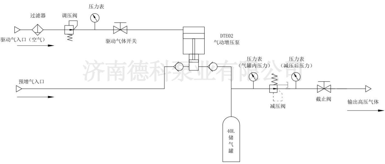 下圖是濟南德科生產(chǎn)銷售氣動增壓系統(tǒng):氣動增壓泵DTE02配40L儲氣罐